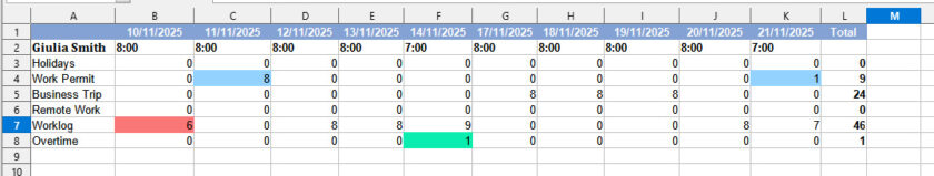 Facciamo un semplice esempio: ecco come appare il Timesheet di Giulia, dipendente di Acme s.p.a. nel mese di novembre.