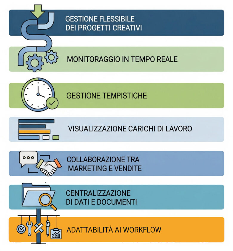 Quando un project manager o un responsabile marketing valuta l’adozione di uno strumento digitale, le esigenze principali riguardano l’organizzazione, la visibilità sul lavoro del team e la possibilità di adattare i processi alle dinamiche aziendali.