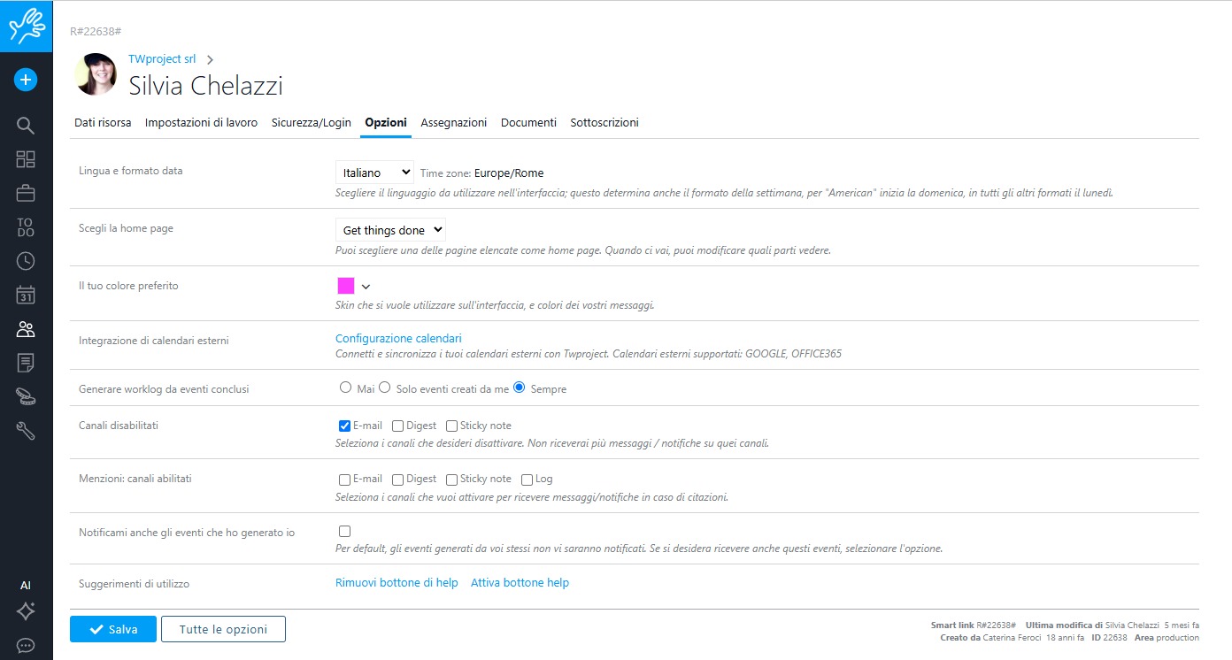 Every user can customize her/his Twproject experience by setting image, interface language, her default home page, default color of notes from myself, etc.